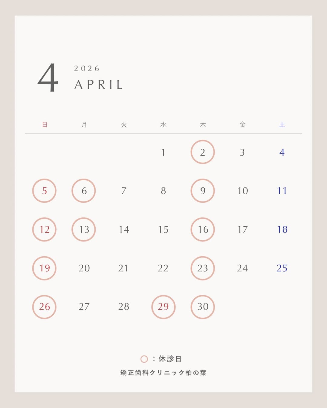 | 月(第1週のみ診療)、 木、日 |