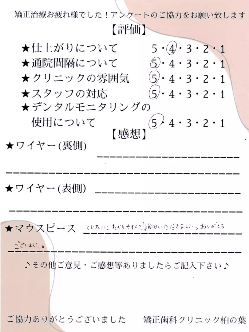 2021年頃からマウスピースでの矯正治療でお世話になりました。他の矯正歯科にも力ウンセリングに行きましたが、矯正歯科クリニック柏の葉さんが一番自分の希望に近い治療方針を提案をしてもらえたのが印象的だった為決めました。通院中も皆さん親切で、長期間でしたが無理なく通うことができました。歯並びもとても綺麗になり満足です。ありがとうございました。