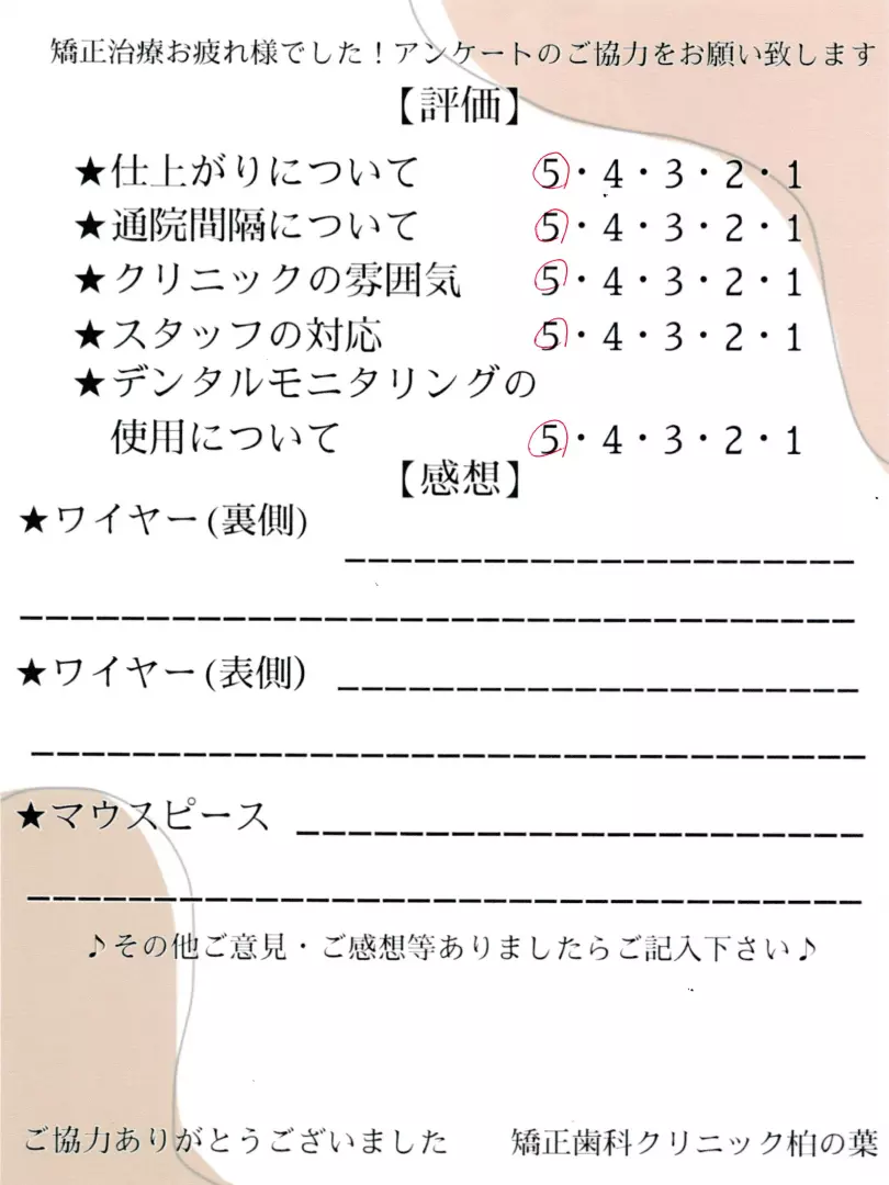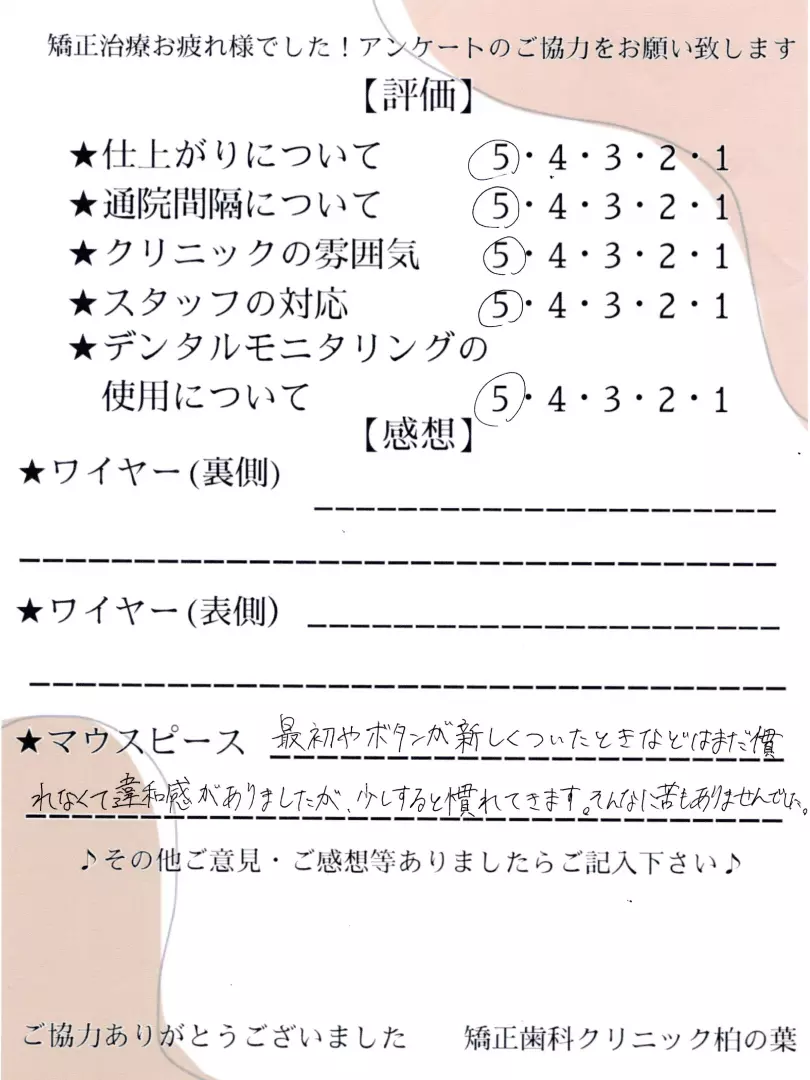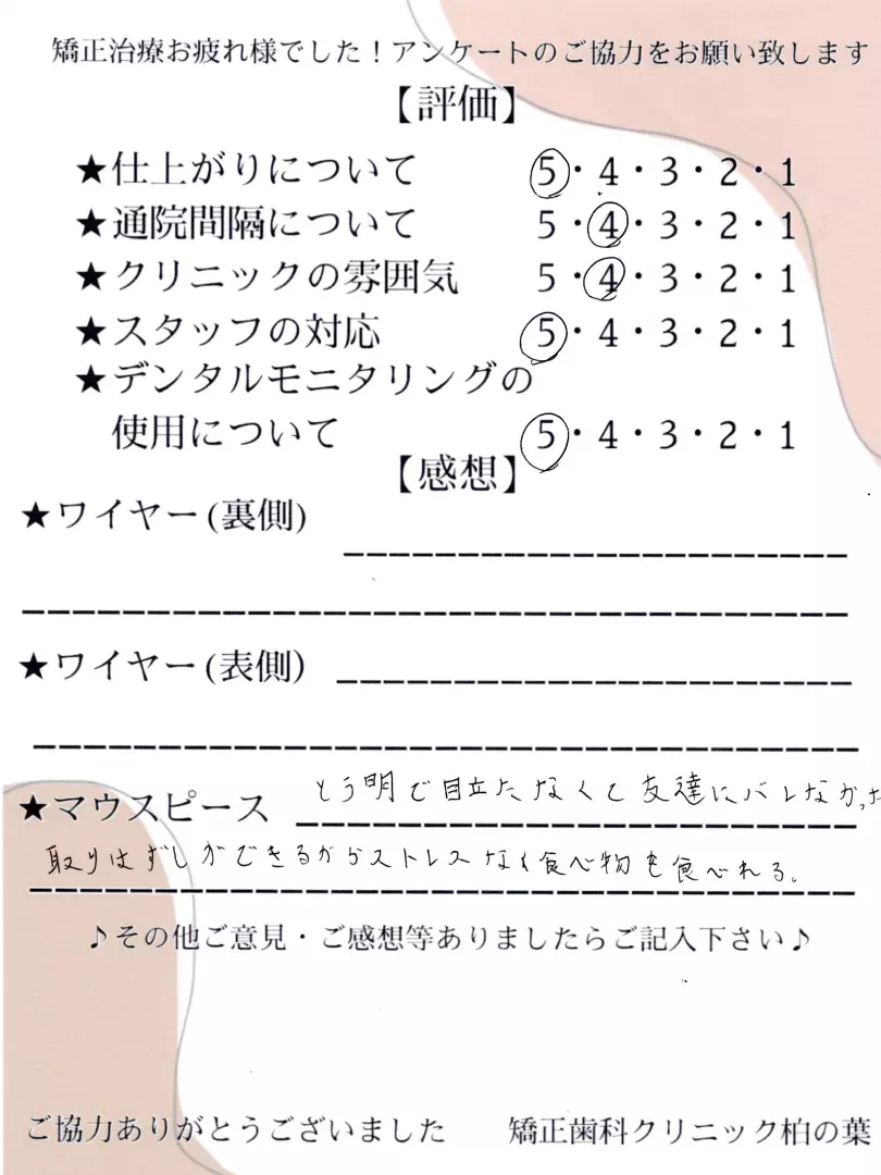 針金結正とマウスピース矯正どちらともさせていただきました。どちらもあまり強い痛みは出ず、二年半ほどやらさせていただきました。スタッフの方々の対応も良く、とても良くしていただきました。
